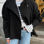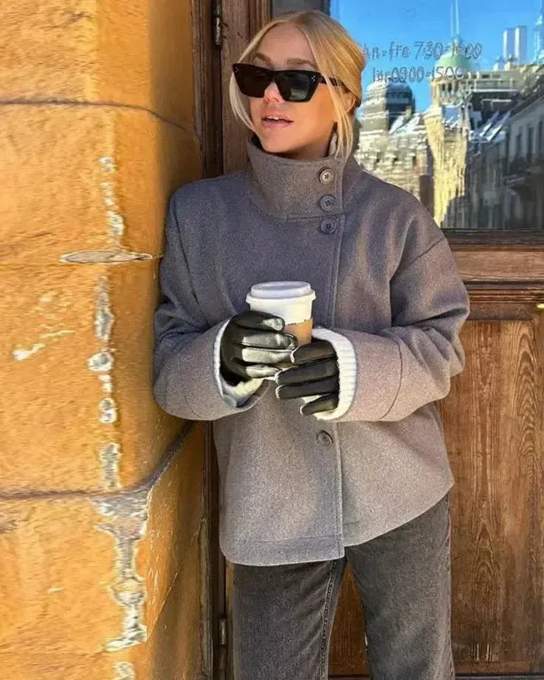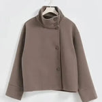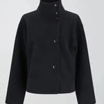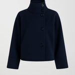 ✔️ Moderní design: Krátký model s asymetrickým zapínáním a velkým límcem