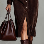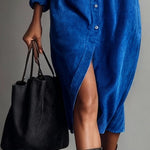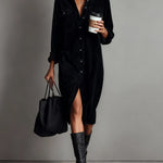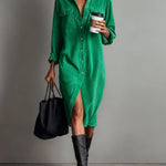Zažijte dokonalou rovnováhu mezi elegancí a pohodlím s těmito midi šaty navrženými pro moderní ženu. Uvolněný střih a stylové dvojité náprsní kapsy dodávají šatům vytříbený retro nádech, který lze snadno kombinovat jak s kotníkovými botami, tak se sneakers.