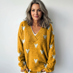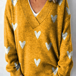 Roztomilý svetr s opakujícím se vzorem srdíček a výstřihem do V