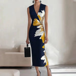 Tyto midi šaty v námořnické modři představují dokonalou kombinaci sofistikovanosti a svěžesti. Květinový potisk v bílé a žluté barvě krásně vyniká a vytváří moderní a ženský vzhled.