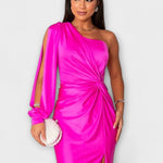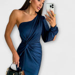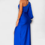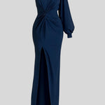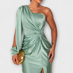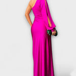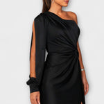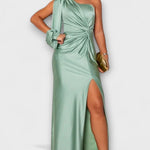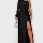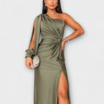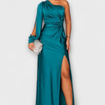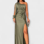 Působivá silueta – Jednoramenný výstřih a rozparek na noze dodávají moderní vzhled