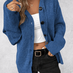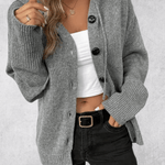 Tento lehký svetr nabízí čistý, otevřený V-výstřih a mírně uvolněný střih, který usnadňuje a osvěžuje vrstvené oblékání. Ribbed manžety a lem dodávají měkkou strukturu, zatímco přední knoflíková léga umožňuje nosit svetr buď otevřený, nebo zavřený. Jasný silueta dělá z tohoto kousku základní kámen šatníku – ideální pro jak uvolněné, tak upravené každodenní vzhledy.