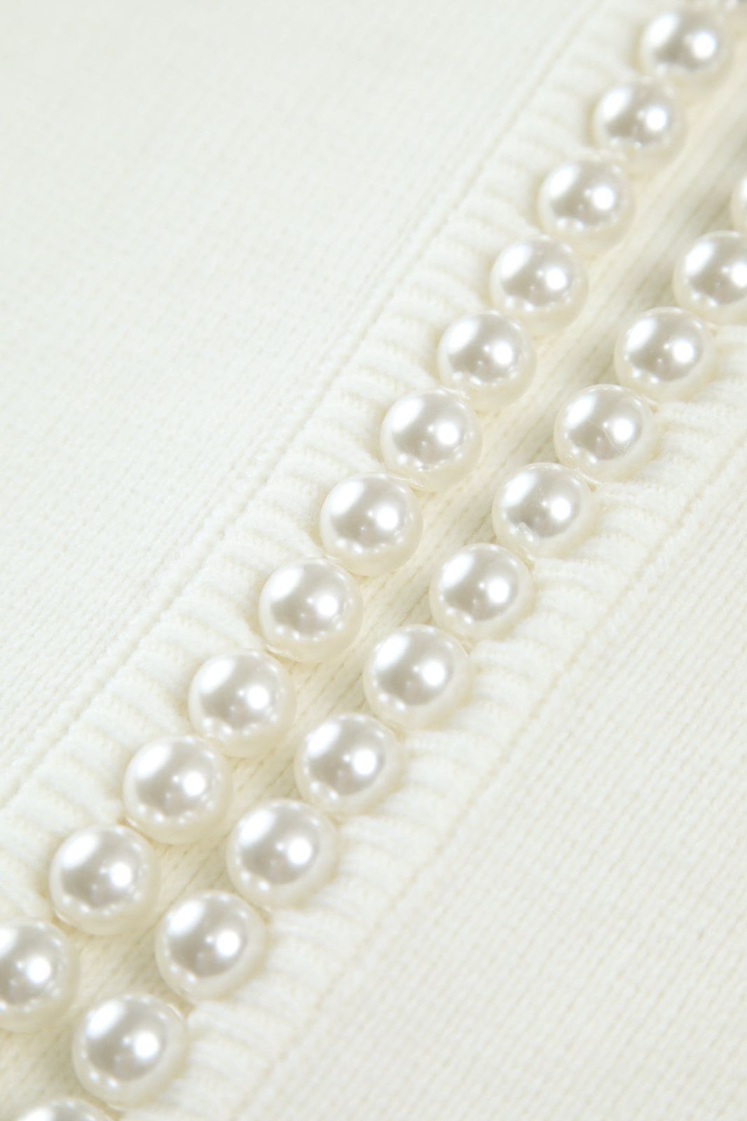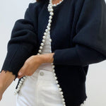 Tento elegantní svetr je navržen s čistým kulatým výstřihem a elegantními perlovými detaily, které dodávají outfitu jemný závěr. Měkký úplet se spojuje s dlouhými rukávy a pružnými manžetami, čímž vytváří čistý a upravený siluetu. Roztrhané okraje spodního lemu a rukávů přinášejí jemný moderní kontrast k klasickým perlovým detailům.