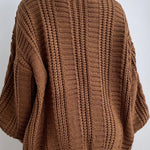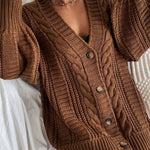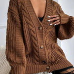 Tento oversize pletený svetr vyzařuje klasické kouzlo s tlustými pletenými detaily a uvolněným, volným střihem. Hluboký V-výstřih, spadlé ramena a široké manžety vytvářejí bezstarostný styl. Velké přední knoflíky dotvářejí design, což z něj činí ideální kousek pro vrstvení – od jemných braletek po pohodlné základní kousky.