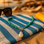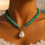Rozměry a materiály: Tento náhrdelník je dokonale veliký pro každého a elegantně podtrhuje váš outfit. Lehký, ale působivý – vyrobený z malých mořských kamenů a pozinkované nerezové oceli, a vyvrcholením je velká emailem pokrytá perla. Unikátní a silný design pro všechny, kteří chtějí vyniknout svou autentičností a stylem.