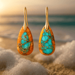 Náušnice Solenea odrážejí živé barvy goanských pláží, inspirované zářivou oranžovou a jasně tyrkysovou. Kamínky mají odstíny od spáleného jantaru po hlubokou modř a vyjadřují spojení slunce a moře.