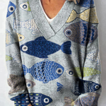 Pěkný rybí umělecký tisk Pletený svetr s výstřihem do V