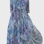 Dlouhé šaty v odstínech levandule a modrékvětinový vzor přináší svěžest, zatímco lehké provedení je ideální pro jarní a letní příležitosti.