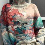 Dámský japonský květinový tisk vynositelný pletený rolák s dlouhým rukávem