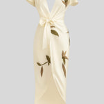 Elegantní a svěží, šaty Dhalia se obepínají kolem vašeho těla díky svému přiléhavému siluetě a lichotivému výstřihu do V. Živý listový vzor a boční zavazování dodávají přirozený a lehký vzhled – ideální pro venkovní akce a denní aktivity.