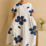 Šaty Petal Whisper jsou vaší volbou, když chcete vypadat jednoduše, svěže a krásně. Se svou čistě bílou základní barvou a výraznými tmavě modrými květy představují nenápadné prohlášení o snadném stylu. Ať už se vydáte na letní piknik, hostíte přátele nebo si jen chcete zpříjemnit teplý den, tyto šaty vám ihned dodají lehkost a sebevědomí. Jejich volný střih a skládaná přední část jsou obzvláště lichotivé v oblasti břicha, což vám dává volnost pohybu a pohodlné dýchání. Spojují hravost i eleganci a jsou to ty vzácné šaty, ve kterých se cítíte naprosto pohodlně – a naprosto sami sebou.