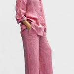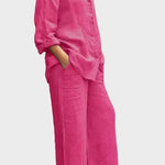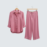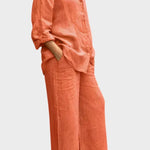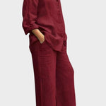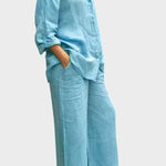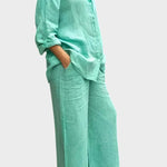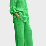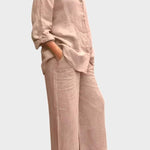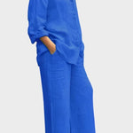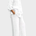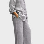 Tento set vyzařuje nadčasovost, eleganci a pohodlí. Celkový vzhled vyrobený z prodyšného a měkkého materiálu dokonale spojuje uvolněný styl a sofistikovaný vzhled. Volná blůza a kalhoty s rovnými nohavicemi nabízejí svobodu pohybu a všestrannost – ideální volba pro ty, kteří chtějí vypadat stylově a cítit se pohodlně v každé situaci.
