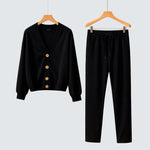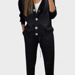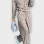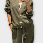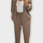 Tento set je dokonalou volbou pro ty, kteří hledají styl a praktičnost v jednom balení. Rovné kalhoty a bunda s velkými knoflíky a klasickým vzhledem spojují uvolněné pohodlí s upraveným vzhledem, který se hodí do různých situací – z práce na výlety. Moderní, pohodlný a vždy elegantní vzhled.