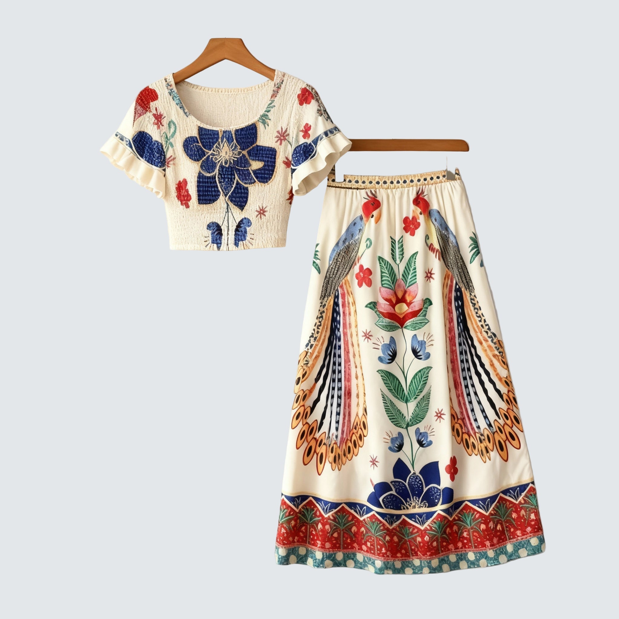 Itzel™ set přináší radostnou kombinaci volnosti, barev a pohybu. Krátký top s řasenými detaily a čtvercovým výstřihem dokonale ladí s dlouhou, splývavou sukní s vysokým pasem. Etnické motivy s pávem a květinovými prvky dodávají outfitu osobitý charakter, který vynikne na dovolené, kulturních akcích i slunečných dnech.
