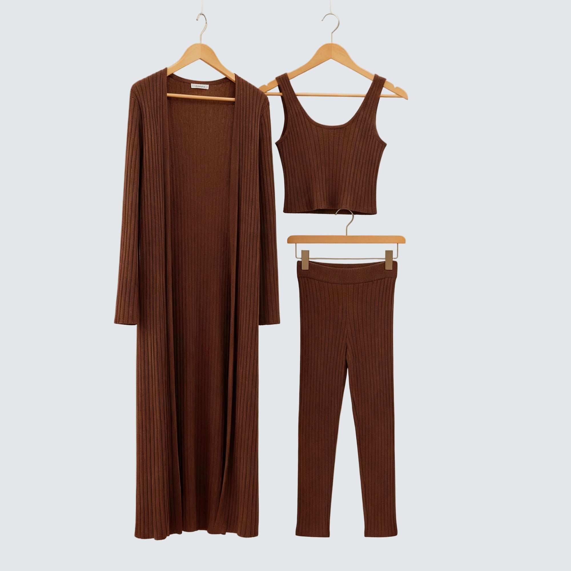 Elisa™ přináší univerzální eleganci v podobě tří dokonale sladěných kousků: krátkého topu, dlouhého svetru a kalhot s vysokým pasem. Každý prvek lze nosit samostatně nebo v kombinaci – vytvoříte tak vzhled přesně podle nálady či příležitosti.