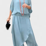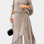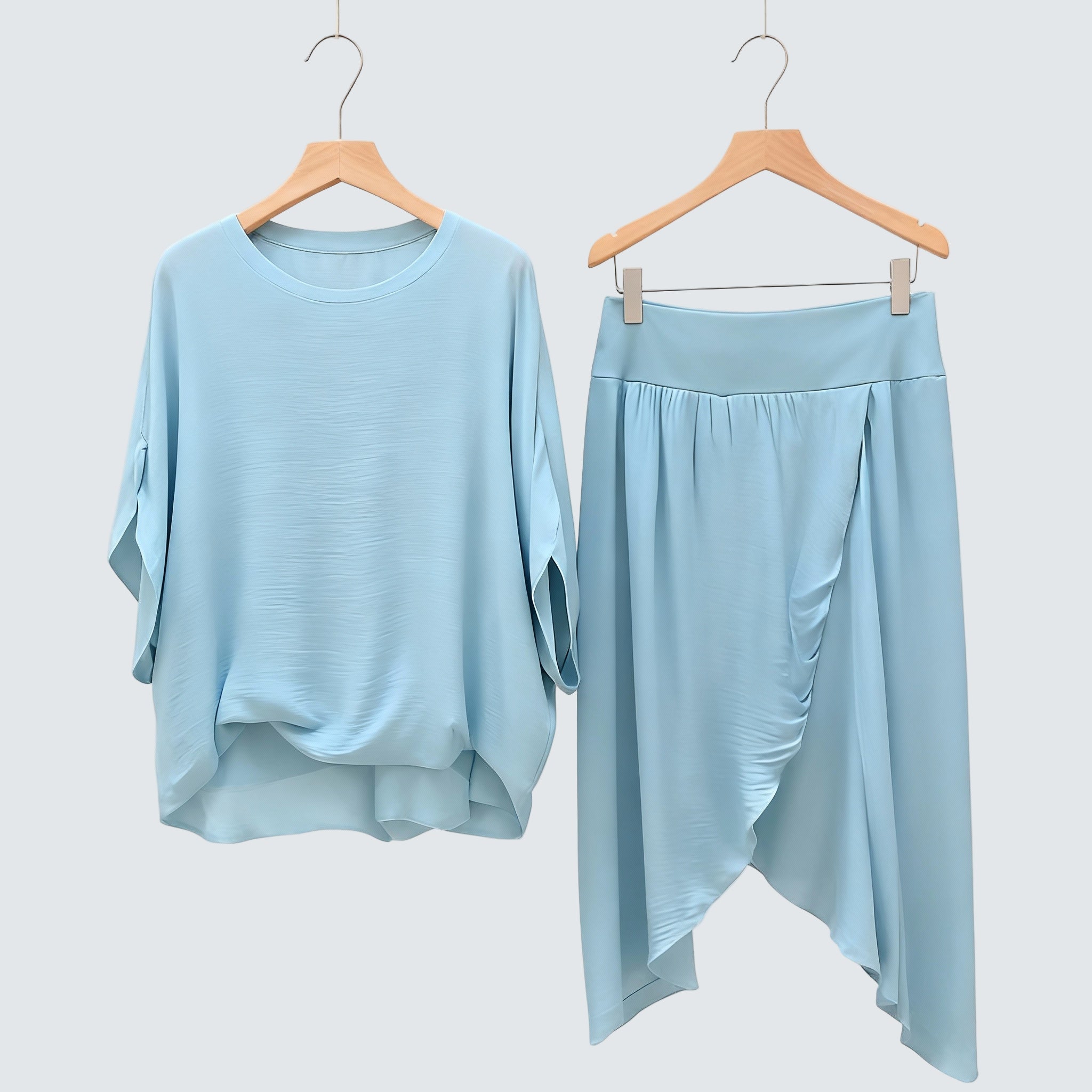 Maravilla™ set přináší vzdušnou rovnováhu mezi pohodlím a sofistikovaností. Volný top a vrstvená zavinovací sukně vytvářejí plynulý, jemně splývavý vzhled, který působí přirozeně a ženský zároveň. Elastický pas zajišťuje pohodlí, zatímco asymetrické linie dodávají pohybu eleganci. Perfektní pro slunečné dny, letní večeře nebo uvolněné chvíle, kdy chcete vypadat nenuceně stylově.
