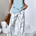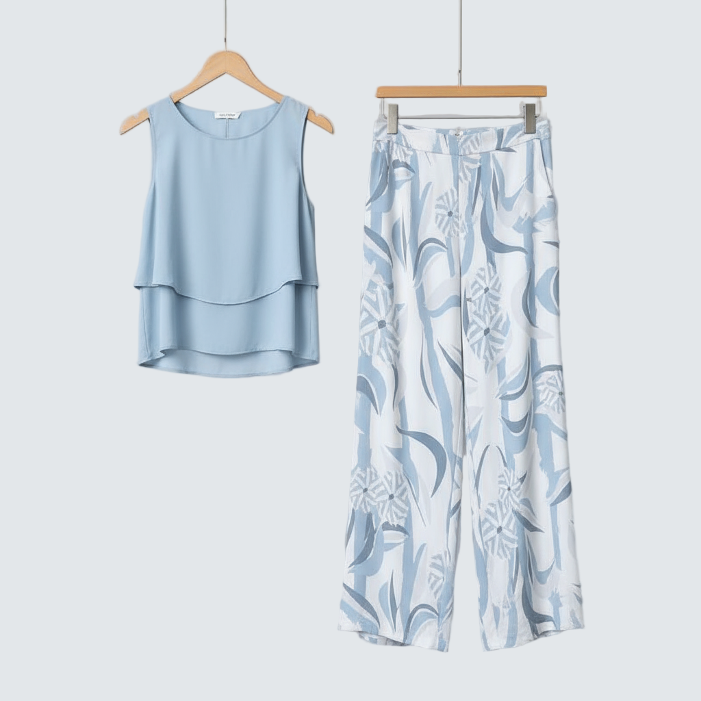 Lunara™ set přináší lehkost mořského vánku a tropickou eleganci v jednom. Jemně modrý vrstvený top ladí s kalhotami s květinovým potiskem, které dodávají outfitu uvolněný, ale vytříbený vzhled. Ideální pro dny, kdy chcete cítit klid pobřeží – ať už jste na dovolené, nebo jen sníte o moři.