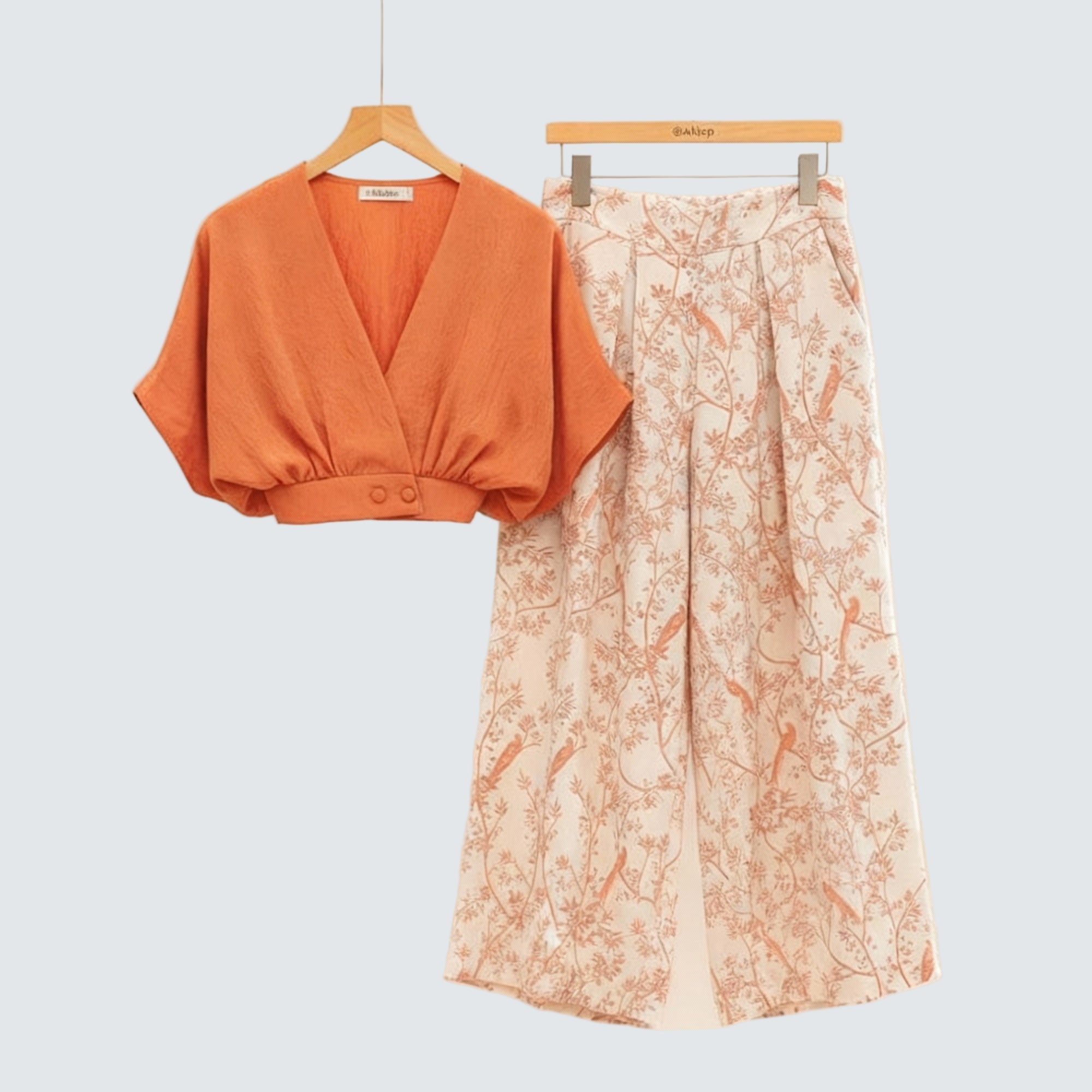 Amaris™ set spojuje pohodlí, lehkost a přirozenou eleganci v moderním boho stylu. Top s V-výstřihem jemně zvýrazňuje ženskost, zatímco široké kalhoty přinášejí volnost pohybu a uvolněný šmrnc. Lehká tkanina zajišťuje svěžest po celý den – ideální volba pro dovolenou, brunch i letní městské dny.