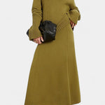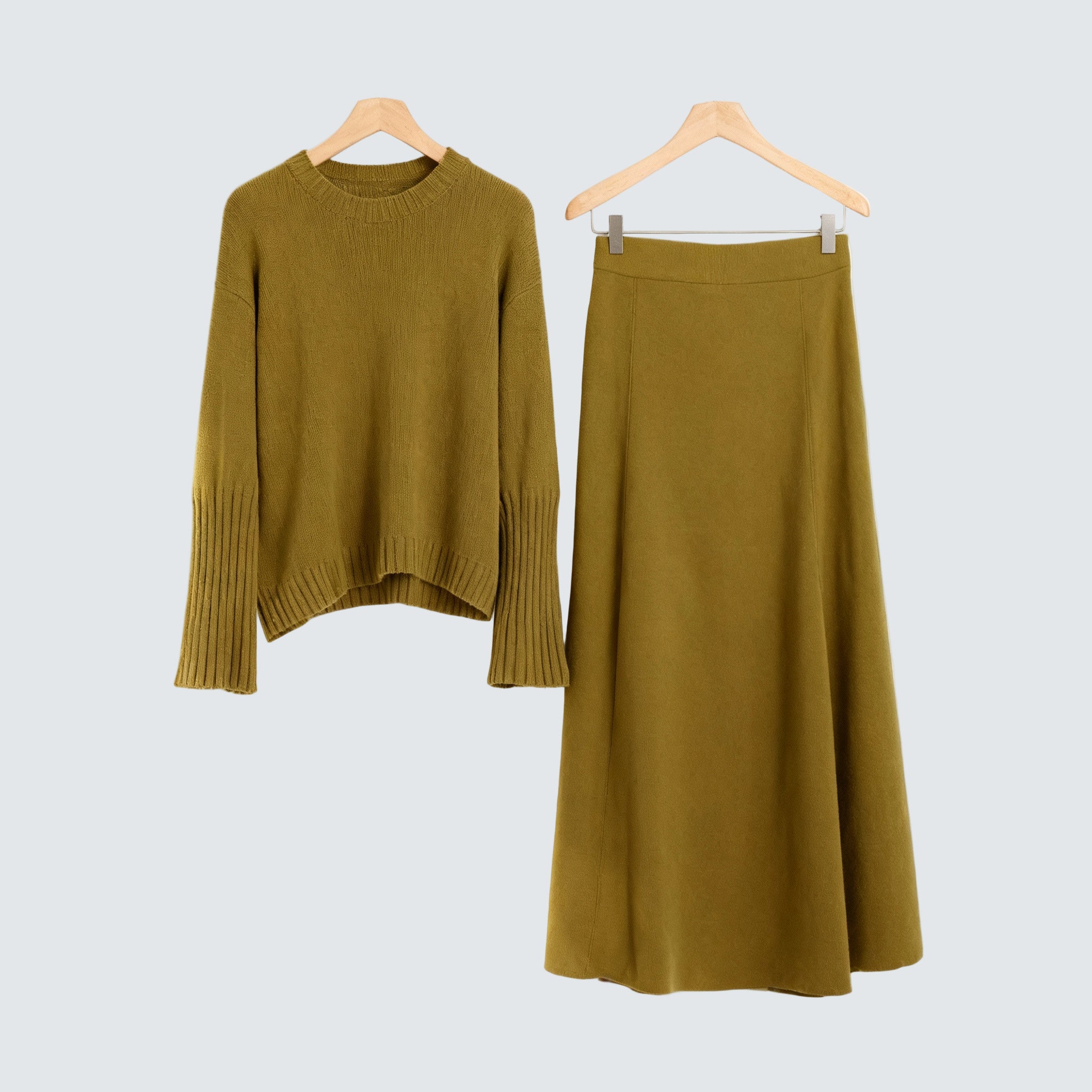 Patricia™ spojuje moderní minimalismus s útulnou elegancí v dokonale vyváženém outfitu. Měkký svetr s vysokým límcem a jemnou ribbovou texturou doplňuje splývavá maxi sukně, která dodává celku pohyb a ženskost.