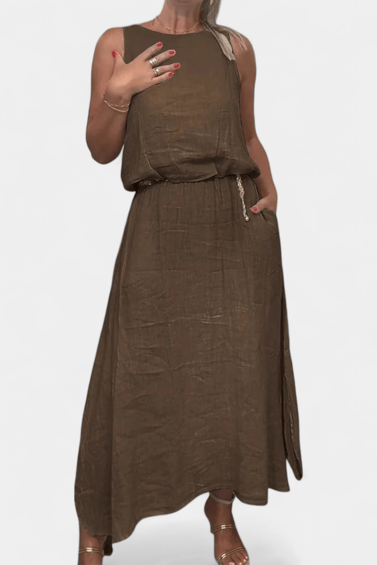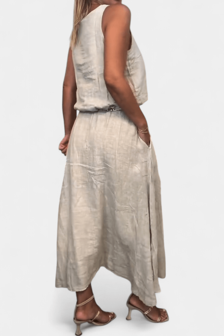 Meliora™ set ztělesňuje letní minimalismus a uvolněnou eleganci. Lehký bezrukávový kabátek a dlouhá sukně se skrytými kapsami vytvářejí vyvážený, sofistikovaný celek. Kombinace lnu a bavlny zaručuje prodyšnost a přirozený vzhled – ideální pro slunečné dny, výlety k moři nebo klidné městské chvíle v lehkém, přirozeném stylu.