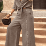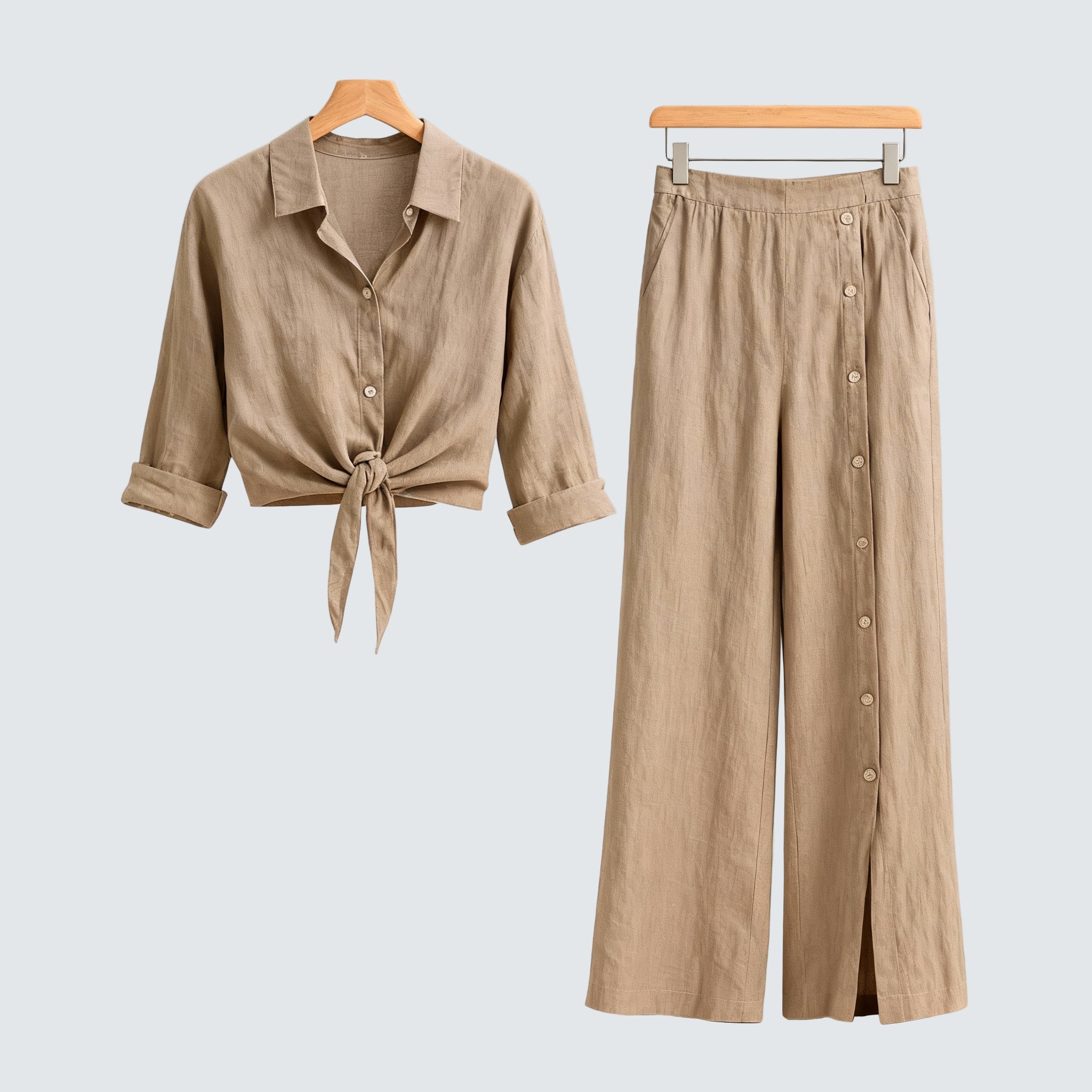 Zoë™ set přináší kombinaci lehkého topu a ladících kalhot pro bezstarostně elegantní vzhled, který se hodí kamkoliv – od domácího pohodlí až po městské procházky či dovolenou. Díky prodyšnému materiálu a uvolněnému střihu působí přirozeně, svěže a zároveň upraveně po celý den.