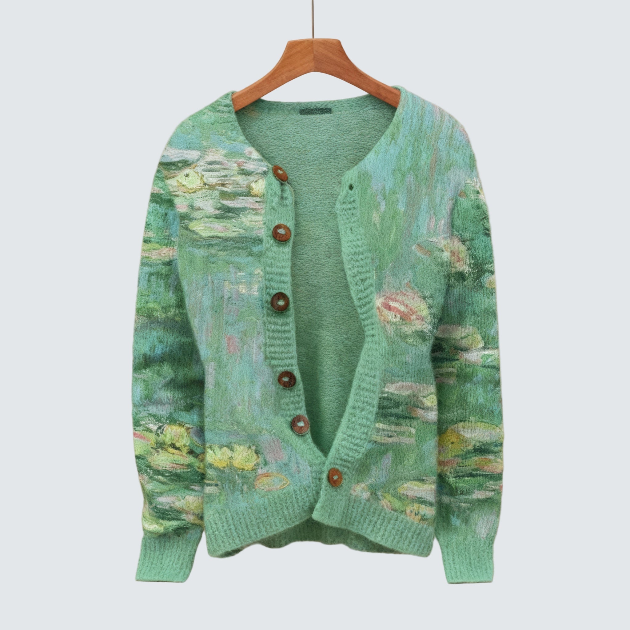 Anwen – Zelený svetr je módní kousek, který spojuje krásu inspirovanou přírodou s pohodlím každodenního nošení. Klidné zelené pozadí svetru a malebné detaily evokují klid vodní zahrady a přinášejí jedinečný prvek do vašeho šatníku. Měkký pletený povrch a dřevěné knoflíky dodávají vrstvenému oblečení decentní eleganci. Ať už chcete oživit každodenní outfit, nebo hledáte něco krásného na rychlé oblečení, tento svetr udělá z každého okamžiku něco zvláštního. Bezstarostně umělecký a duši uklidňující – to je ten kousek, který přitahuje pohledy.