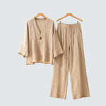 Eli™ set přináší uvolněný, ale elegantní vzhled, který se skvěle hodí pro teplé dny. Top s V-výstřihem jemně zvýrazňuje linii krku, zatímco rovné kalhoty zajišťují pohodlí a moderní siluetu. Ideální volba pro městské procházky, víkendové výlety nebo chvíle klidu v letní atmosféře.