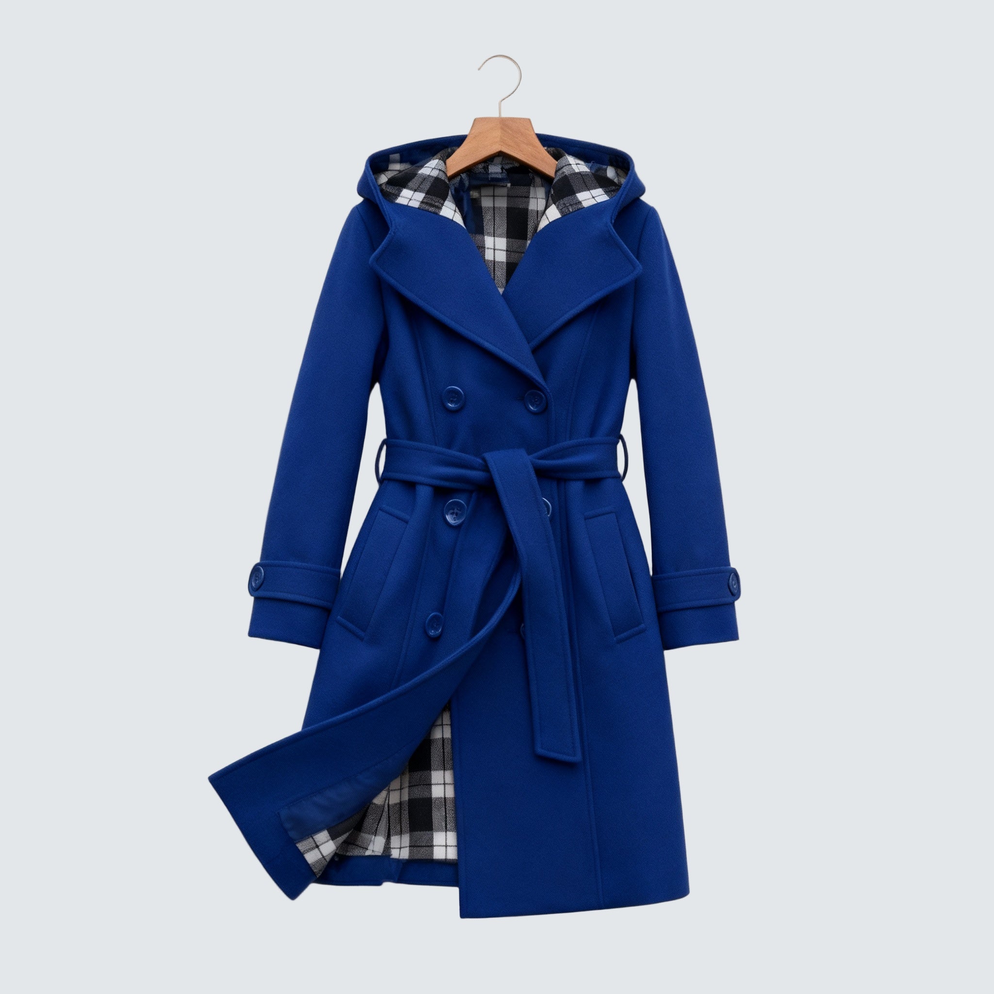 Dvouřadový střih s lesklými knoflíky a nastavitelným páskem vytváří ladnou, ženskou siluetu, zatímco měkká kostkovaná podšívka poskytuje hřejivost a pohodlí po celý den.
