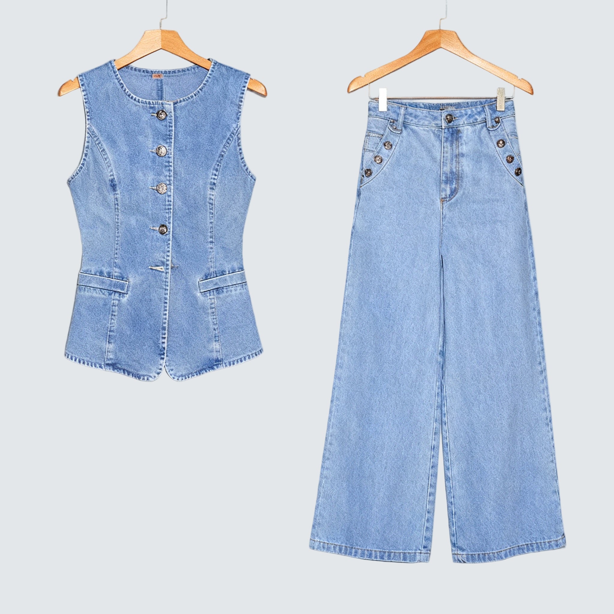 Ludovica™ set přetváří klasický denim do podoby moderní elegance. Bezramenná zapínací vesta lichotí postavě a vytváří ženský kontrast k volným kalhotám s vysokým pasem. Společně tvoří outfit, který spojuje sílu, styl a pohodlí — ideální pro ženy, které chtějí vyniknout s lehkostí.