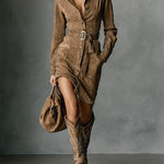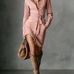 Zažijte elegantní a vytříbený vzhled s těmito nádhernými midi šaty, navrženými tak, aby zvýraznily vaši siluetu a pozvedly váš styl. Šik reverzní límec a dlouhé rukávy poskytují dokonalou rovnováhu mezi hřejivostí a glamourem.