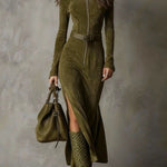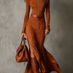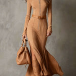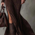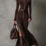 Dodejte svému šatníku nádech elegance a vytříbenosti s těmito úchvatnými hnědými maxi šaty. Vypasovaný střih s decentním zipem vpředu a smyslným vysokým rozparkem zvýrazní siluetu a nabízí dokonalou rovnováhu mezi vintage půvabem a moderním stylem.