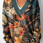 Vintage květinová umělecká tisková pletená v-neck svetr